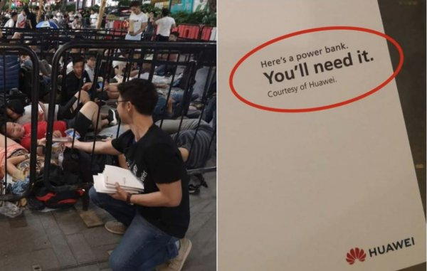 Раздача пауэрбанков произошла возле App Store в Сингапуре. Представители Huawei приблизились к людям, стоявших в очереди за новыми iPhone, и вручили им аксессуары для зарядки смартфонов. На сувенире имелась надпись: «Это пауэрбанк. Он вам нужен. Предоставлено Huawei». Таким образом китайская фирма намекнула, что мобильное устройство от Apple функционирует от одной зарядки лишь небольшое время. Huawei раздала внешние аккумуляторы объемом 10 000 мАч, в РФ они продаются по цене 4490 рублей.