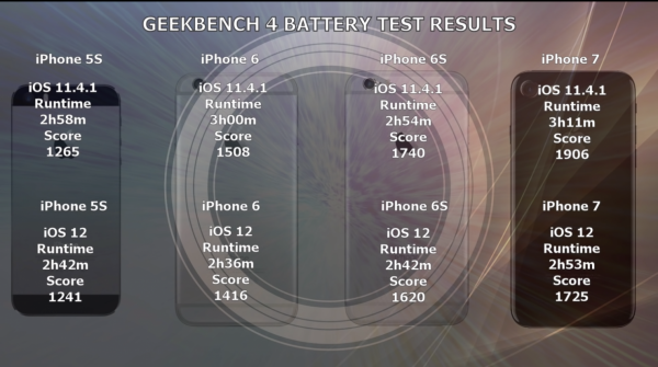 Автор сравнения отмечает, что для чистоты эксперимента, на всех устройствах были установлены новые оригинальные аккумуляторы. Всего в испытании приняли участие четыре смартфона: iPhone 5s, iPhone 6, iPhone 6s, iPhone 7. Все устройства были заряжены до 100%, и были сначала протестированы в iOS 11.4.1, а затем и в iOS 12, используя известный бенчмарк Geekbench 4. Итоги сравнения оказались следующими: