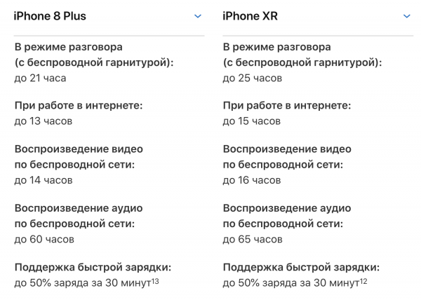 Как видно из представленной статистики, iPhone XR по времени автономной работы превзошел не только iPhone XS, но даже и iPhone XS Max. Учитывая, что пальма первенства всегда была за Plus-версиями, это удивительный результат. Если начать сравнивать iPhone XR с предыдущим рекордсменом, iPhone 8 Plus, то можно также увидеть безоговорочное превосходство новинки.